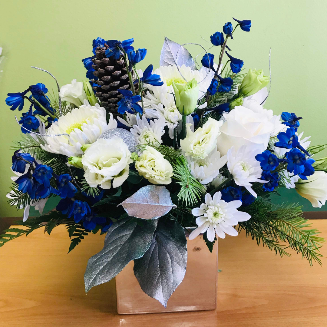 The shimmer of silver, blue, and white florals makes for a Holiday Delight.