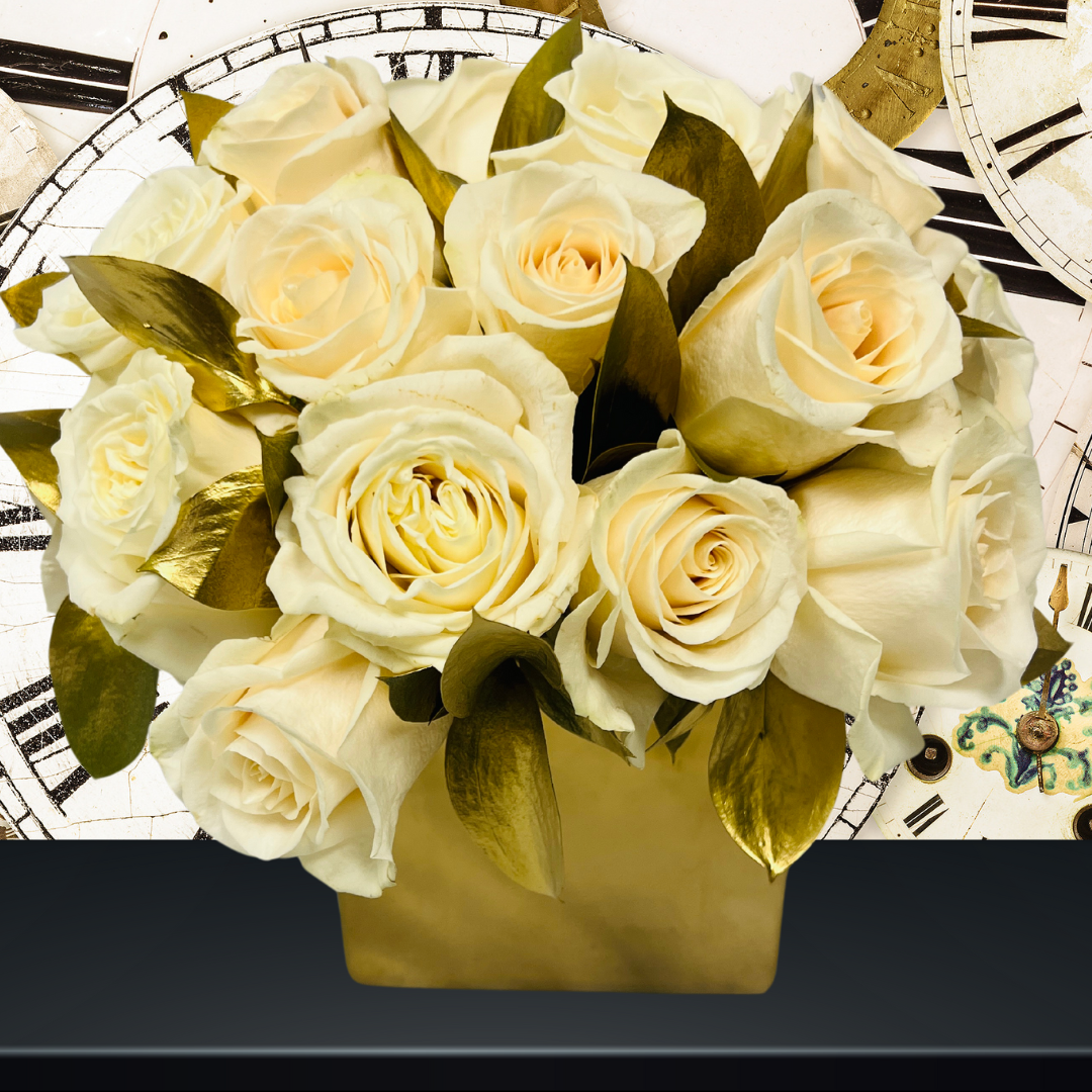 This arrangement captures the essence of celebration and the richness of a new beginning. We wish you golden opportunities and prosperity in the new year. The design will surely enhance your celebration with its gold cube, gold metallic leaves, and two dozen white roses.